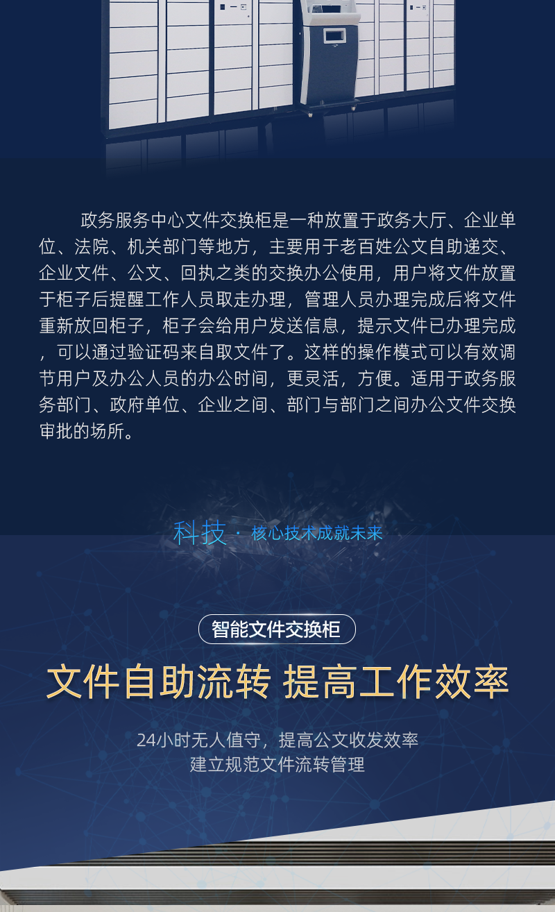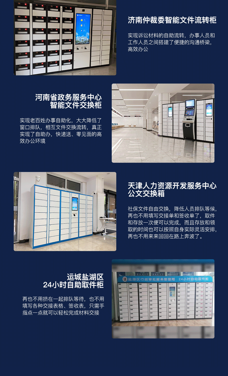 24小时自助存取件柜24小时自助存取件柜是一种放置于政务大厅、企业单位、法院、机关部门等地方,主要用于老百姓公文自助递交、企业文件、公文、回执之类的交换办公使用,用户将文件放置于柜子后提醒工作人员取走办理,管理人员办理完成后将文件重新放回柜子,柜子会